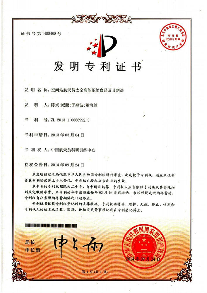 神舟太空食物高科技(深圳)无限公司已稳健走过9年过程,一直专注于航天员食物平易近用化、财产化营业。专利号为ZL2。3。这一空间坐航天员食物专利手艺,为公司的产物建立了的法令樊篱,使其正在市场所作中具有绝对劣势。